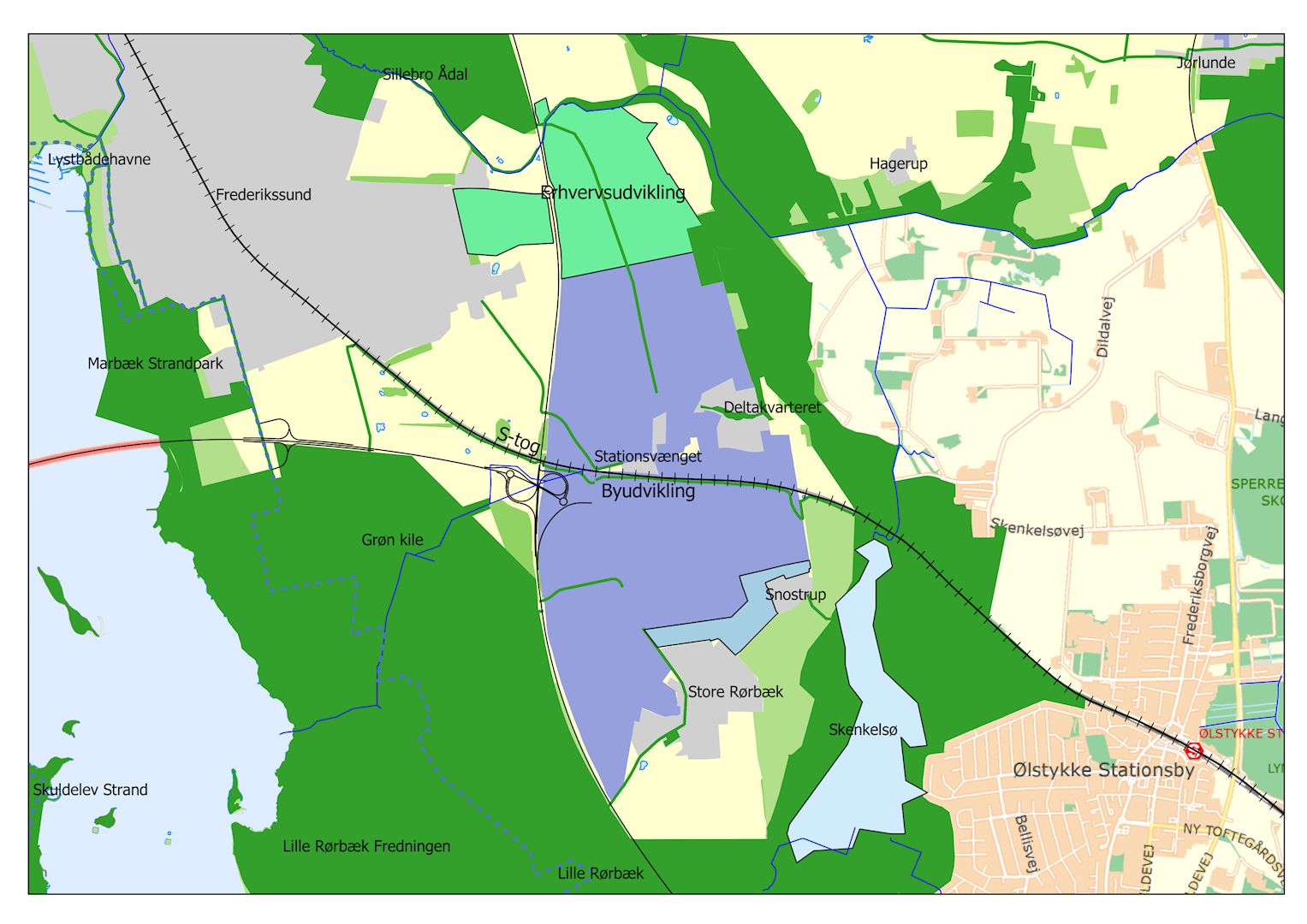 Den røde tråd i udviklingen af vores byer er, at de udover at være gode rammer for hverdagslivet skal fremme fællesskaber, så byerne giver de bedst mulige betingelser for borgernes sociale liv. Kommunen fremmer det gode liv i byerne ved at arbejde for, at hverdagens aktiviteter bliver udgangspunkt for møder indenfor og mellem generationerne. Handel, uddannelse, kultur og idræt skal lokaliseres, så det understøtter det sociale liv i byerne. Samtidig skal byerne give adgang til bynær natur og give gode muligheder for at borgerne kan bruge de naturskønne omgivelser i hele kommunen. Naturen udgør fundamentet i kommunens identitet og tiltrækningskraft. Den inviterer til bevægelse i hverdagen, gør kommunen attraktiv for byudvikling og er samtidig en vigtig basis for kommunens turismeudvikling. Vores fjorde er værdifulde, både som natur og til rekreativ udfoldelse. I kombination med vores grønne natur har Frederikssund Kommune helt særlige kvaliteter. Det ønskes understøttet ved at skabe flere kystnære muligheder for ophold og styrke kommunens rekreative stier, så adgangen til både det blå og det grønne styrkes.
