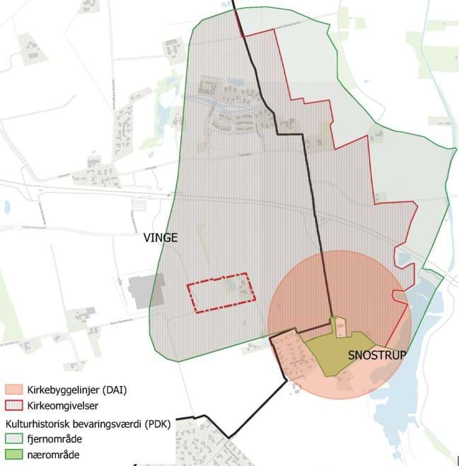 Figur 3: Kirkeomgivelser med kulturhistorisk bevaringsværdi samt kirkebyggelinje omkring Snostrup Kirke (Kommuneplan 2021). Planområdet er markeret med rød stiplet linje.