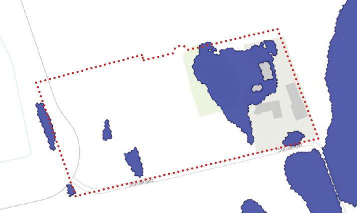 Figur 2: Arealer udpeget som oversvømmelsestruede 'bluespots' i og omkring planområdet (Kommuneplan 2021)