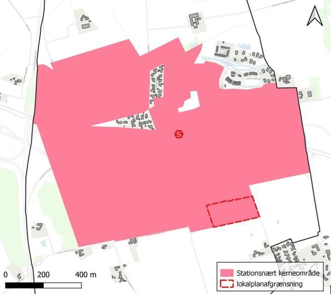 Figur 4: Kortet viser det stationsnære kerneområde i det centrale Vinge (Kommuneplan 2021). Planområdet er markeret med rød stipletlinje.