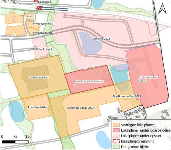 Aktuelle planområde er en del af sidstnævnte og udlægges til offentlige formål i form af grønne fællesskaber og kommunale servicefunktioner. Der gives mulighed for åben-lav bebyggelse og en bebyggelsesprocent på maks. 15.