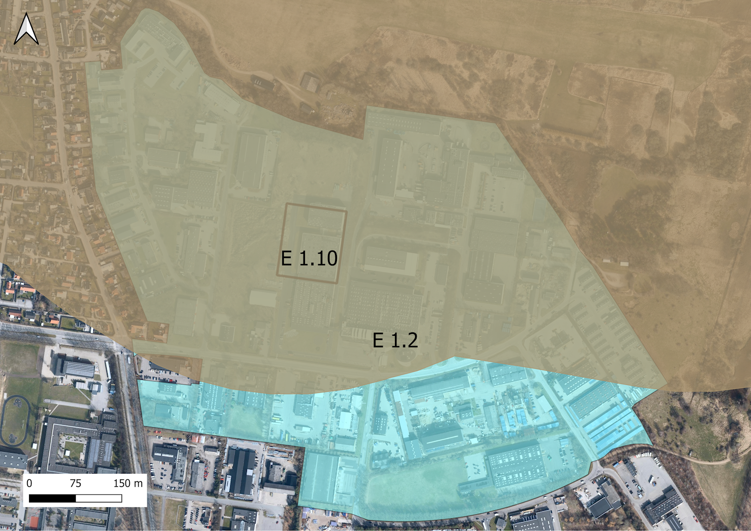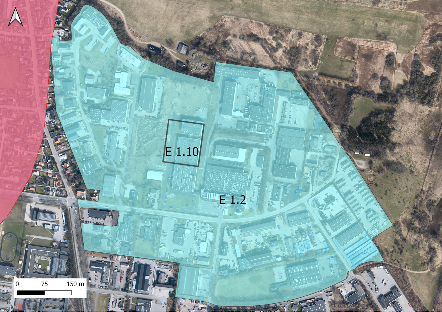 Ved endelig vedtagelse af dette kommuneplantillæg sker en delvis aflysning af kommuneplanramme E 1.2 for det område der bliver til kommuneplanramme E 1.10. Nedenfor ses kommuneplanramme E 1.10 og den nye afgrænsning af kommuneplanramme E 1.2.