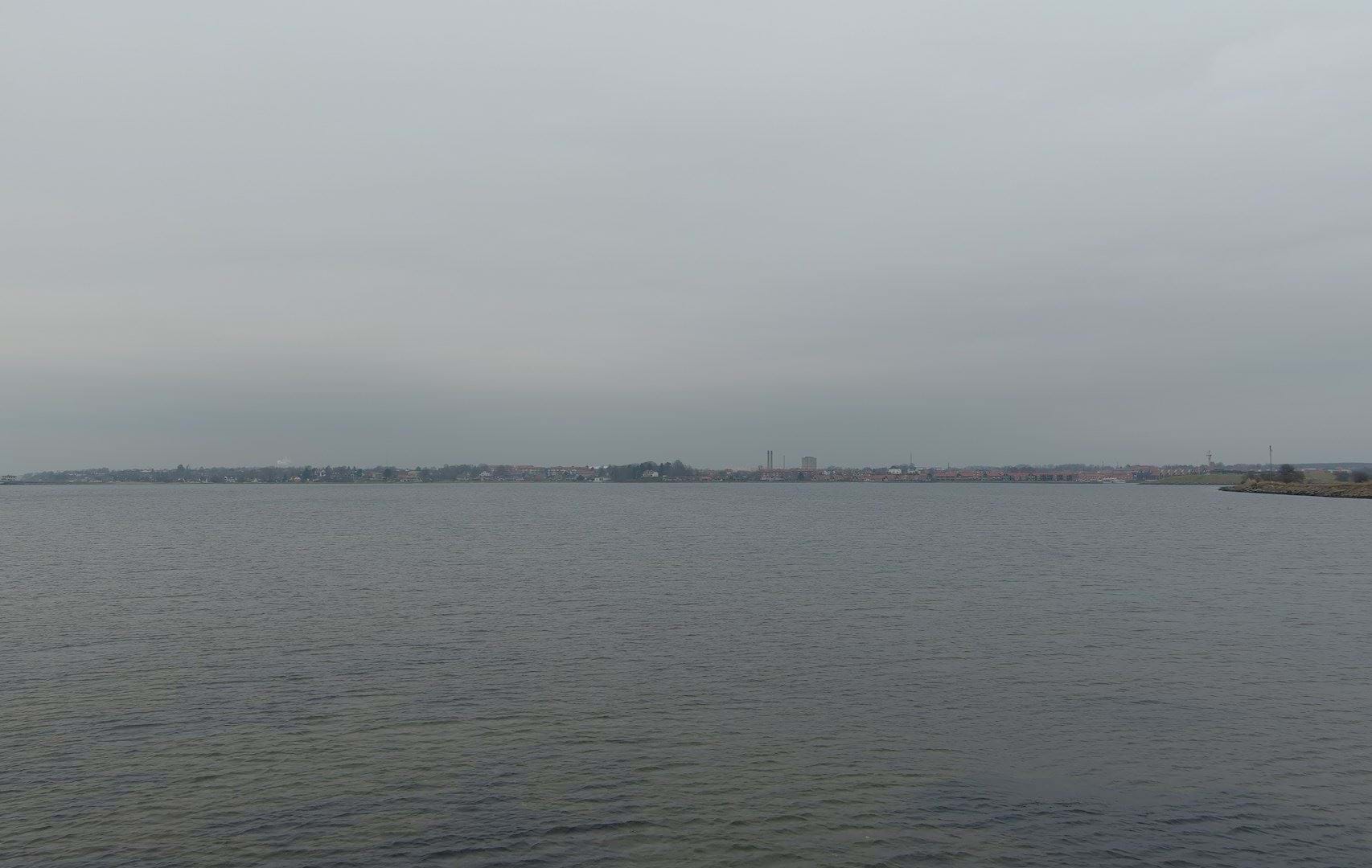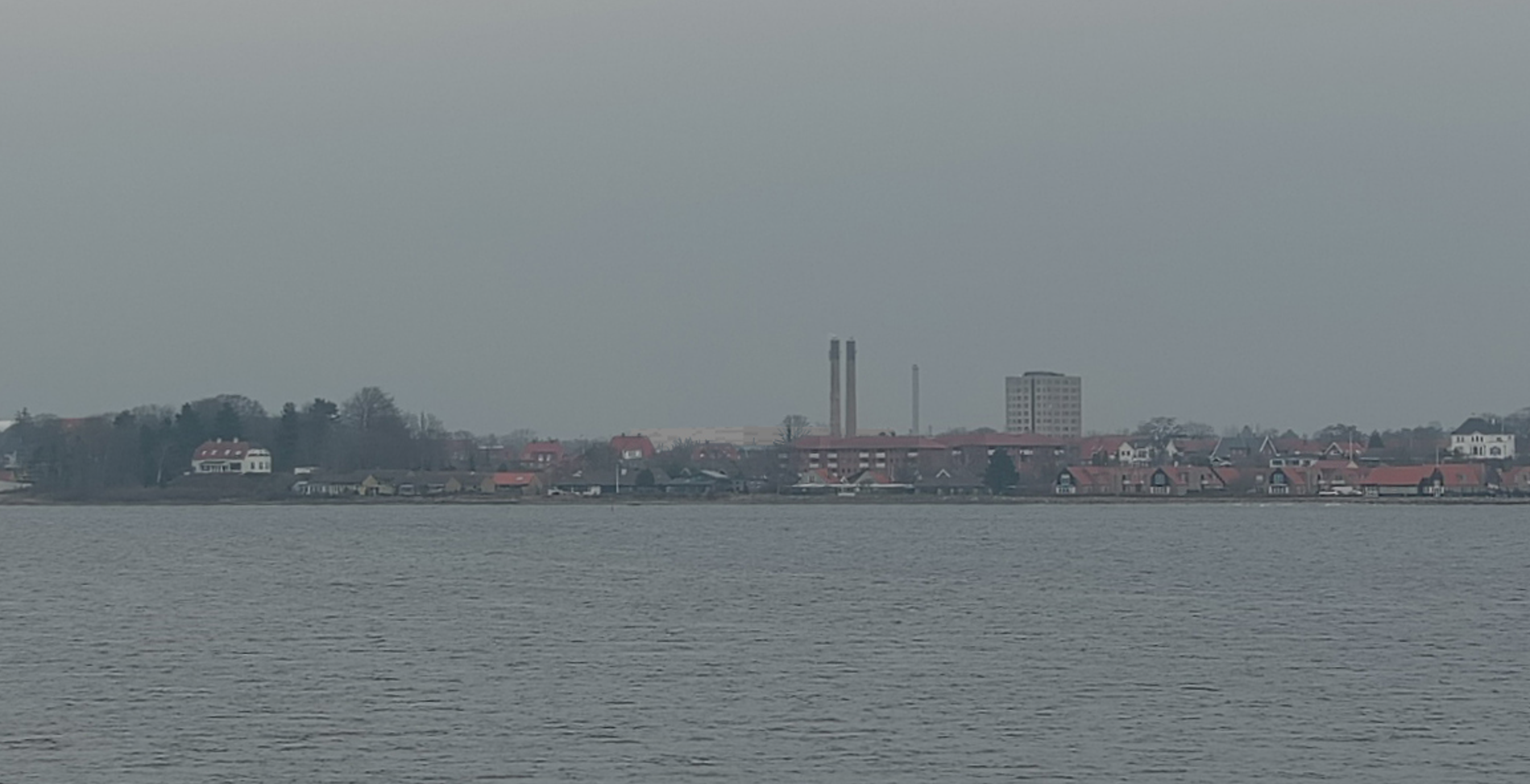 Kystlinjen for Frederikssund by med visualisering af ny bebyggelse i 25 meters højde til venstre for skårstene tilhørende fjernvarmeværket. Visualiseringen er lavet 2,6 km fra bebyggelsen.